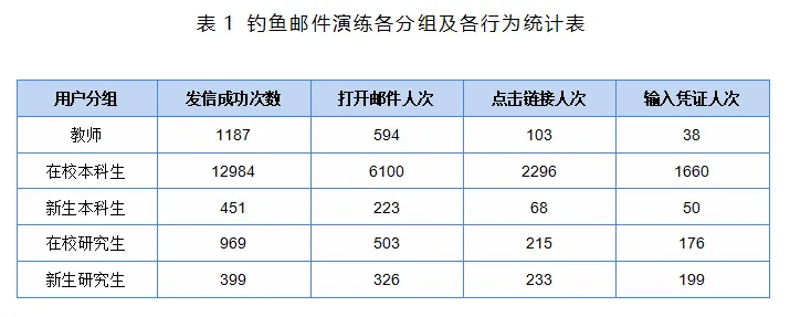 本次演练共发送钓鱼邮件15990封,其中教职工1187封,在校本科生12984封,新生本科生451封,在校研究生969封,新生研究生399封。累计统计打开邮件、点击链接、输入凭证三种行为。具体分组及行为统计情况如表1所示。